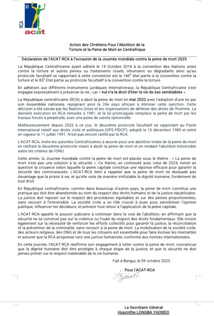 À l’occasion de la Journée mondiale contre la peine de mort, placée cette année sous le thème « La peine de mort n’est pas une solution à la sécurité », l’Action des Chrétiens pour l’Abolition de la Torture et de la Peine de Mort en Centrafrique (ACAT-RCA) a publié une déclaration réaffirmant son attachement à la défense du droit à la vie et son appel à une abolition irréversible de la peine capitale en République centrafricaine.