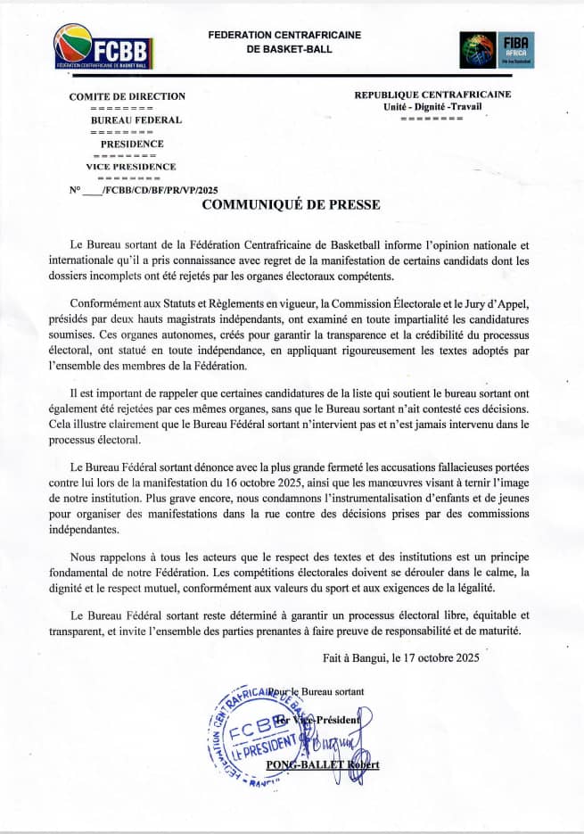 Dans un communiqué de presse publié le 17 octobre 2025 à Bangui, le Bureau fédéral sortant de la Fédération Centrafricaine de Basketball (FCBB) a réagi aux manifestations et aux accusations portées contre lui. Il dénonce des allégations jugées infondées, condamne l’instrumentalisation de jeunes dans les protestations et réaffirme la transparence du processus électoral conduit par des organes indépendants.